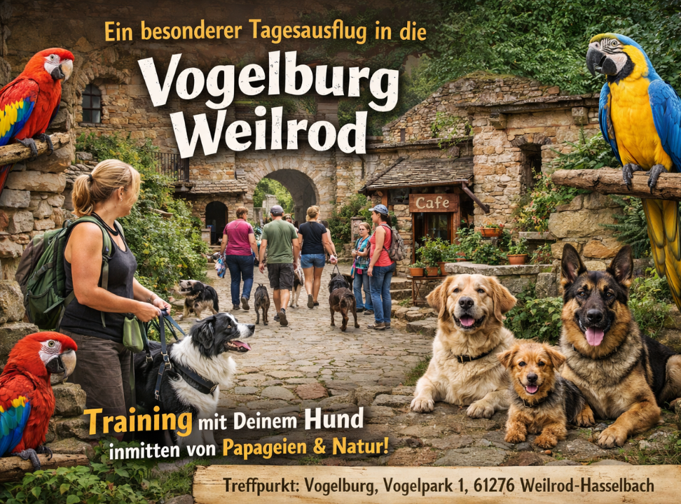 Du bist herzlich zu einem besonderen Tagesausflug in die Vogelburg Weilrod eingeladen – einem gemeinsamen Trainingserlebnis, das gezielt für Teilnehmerinnen und Teilnehmer der Aufbaukurse gestaltet ist. Die Anlage liegt mitten im Naturpark Hochtaunus und bietet eine außergewöhnliche Kulisse mit einer großen Vielfalt an zutraulichen Papageien, verwinkelten Wegen, offenen Bereichen und einer ganz eigenen Atmosphäre.